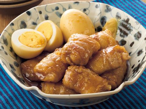 1 6 3.2の余分な脂をキッチンペーパーでふき取り、Aを加え、煮立ったらゆで卵を加え、落としぶたをして煮汁にとろみがつくまで4~5分煮る。